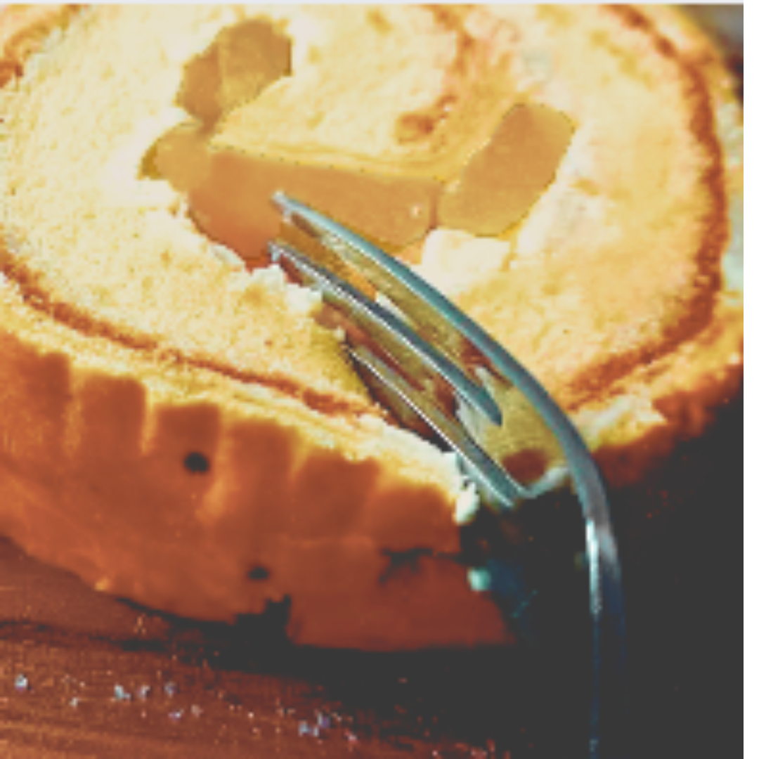 通常のロールケーキと違い、厚さ数ミリのシュー生地で外側を巻き上げることでしっとりとした食感を作り上げる。