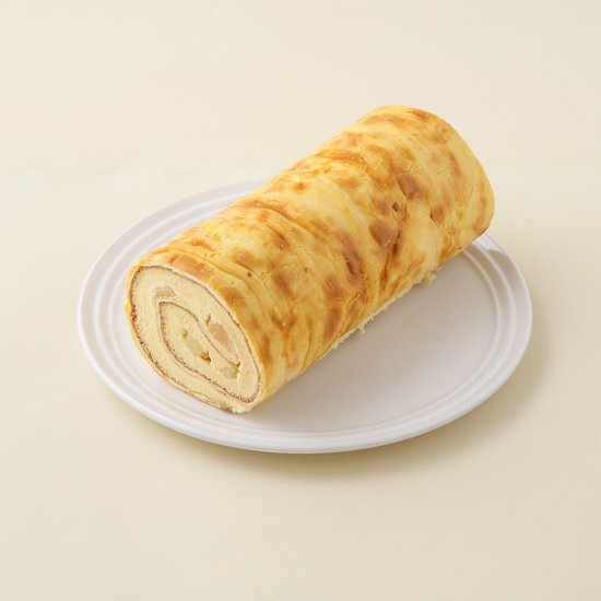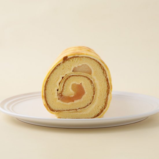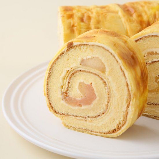 通常のロールケーキと違い、厚さ数ミリのシュー生地で外側を巻き上げることでしっとりとした食感を作り上げる。
